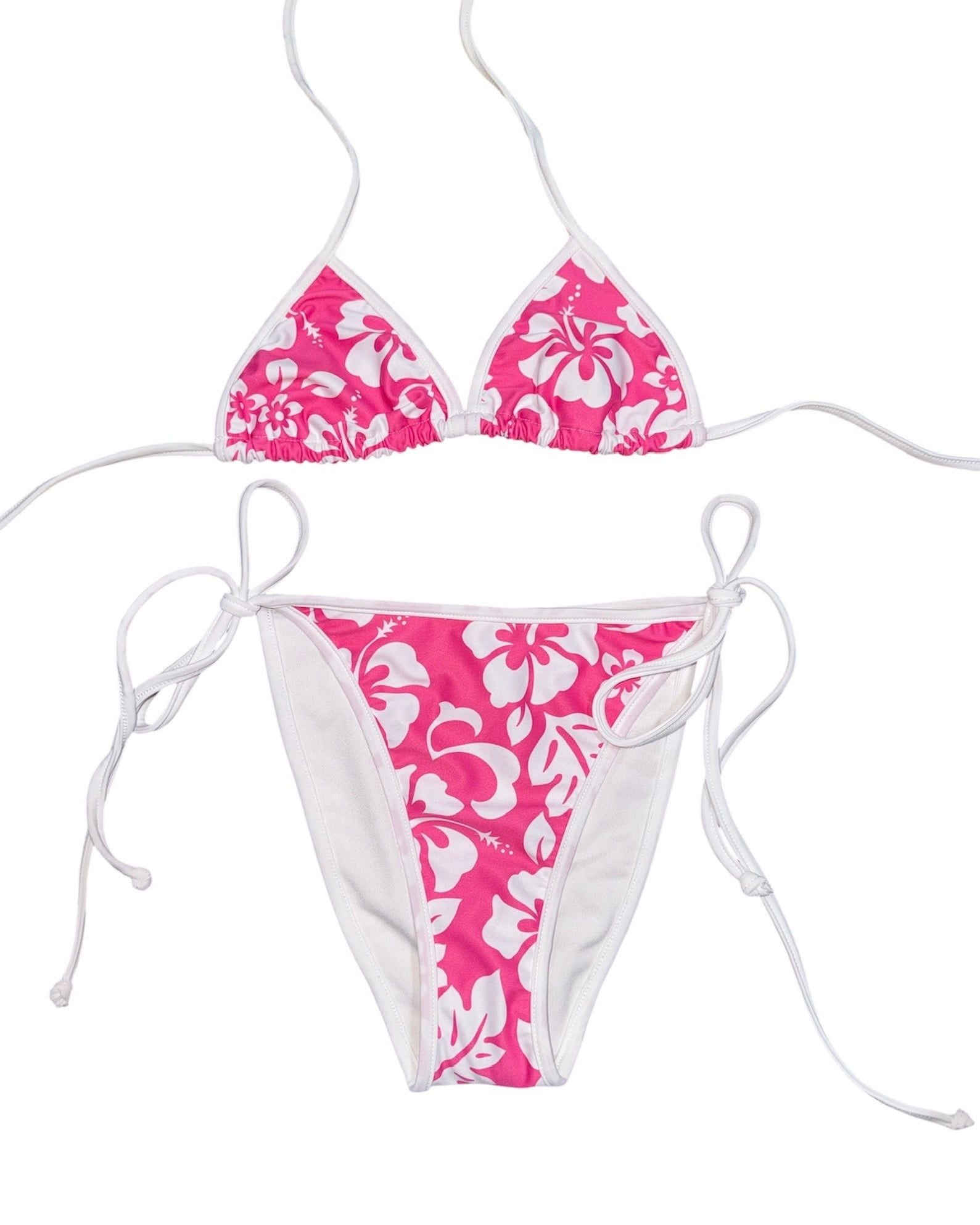 Pink Aloha Hibiscus print with white binding. Chlorine resistant. Lined and tie up high leg cut.