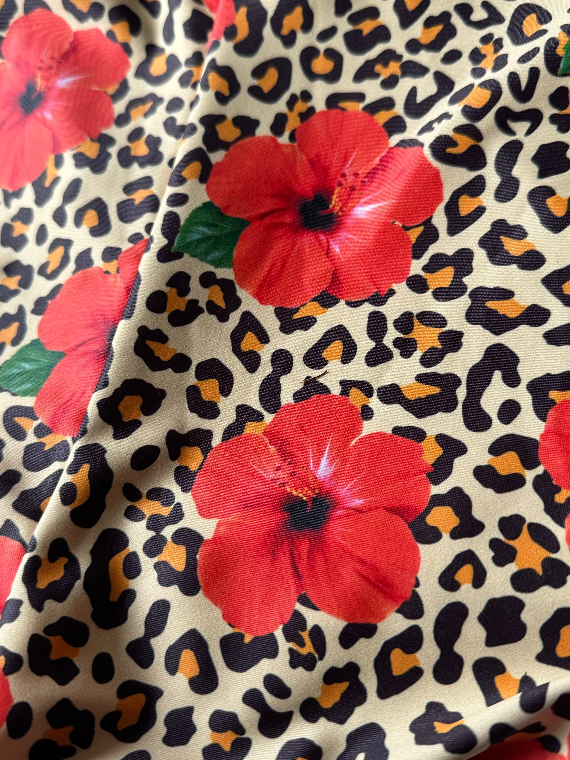Leopard and hibiscus print with white binding. Chlorine resistant. Lined and tie up straps.